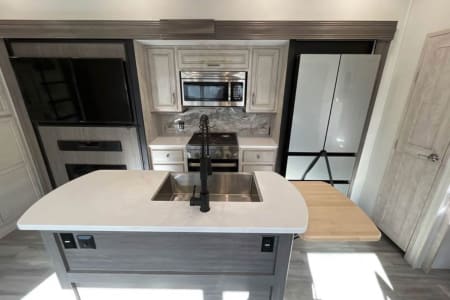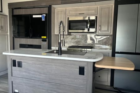 With 4 slide-outs, a kitchen island, theater-style seating and panoramic windows, this unit feels more like a home away from home than a typical camper.