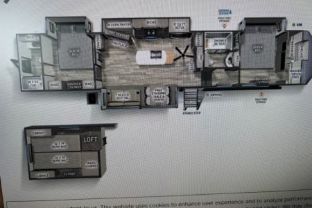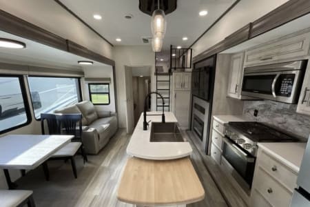 Step into a spacious 43′ 5″ fifth-wheel that offers two separate queen-bed bedrooms, two full baths, plus a loft—so everyone gets their own space.