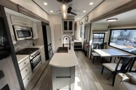 Whether you're relaxing inside or under the 15-foot electric awning outside, your group will have the space to unwind together or spread out.