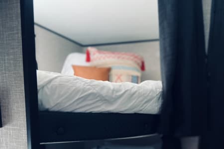 A comfortable queen master, double bunk beds, and a convertible dinette/sofa sleep up to 8 guests. The full kitchen includes a fridge, microwave, stove, and all the cookware you’ll need to whip up meals after a day of exploring. Ice-cold A/C, cozy heat, and smart storage make every trip feel effortless.
