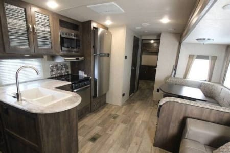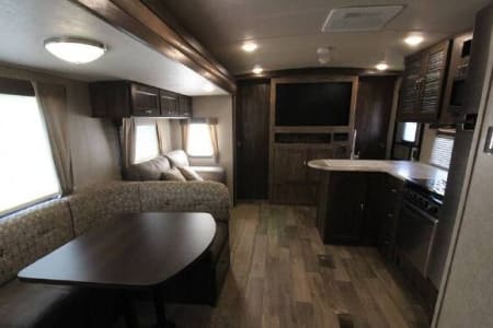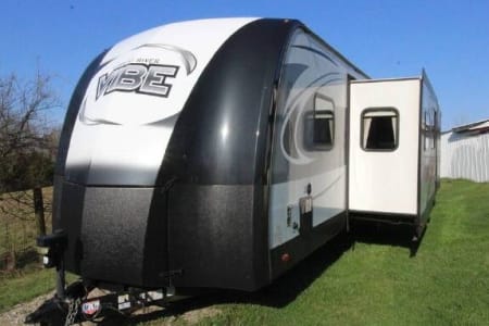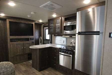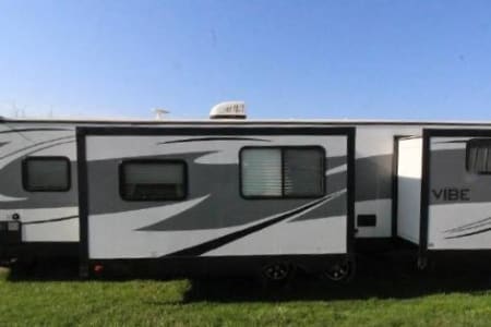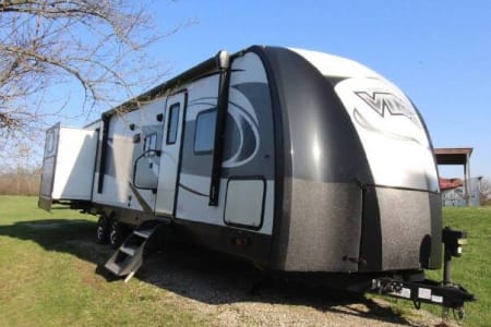 - Power awning, propane furnace, ceiling fan, and air conditioning