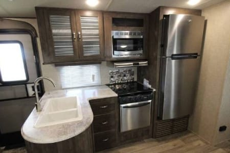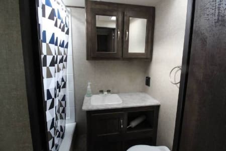 - Water capacities: fresh water (44 gallons), grey water (64 gallons), and black water (30 gallons)