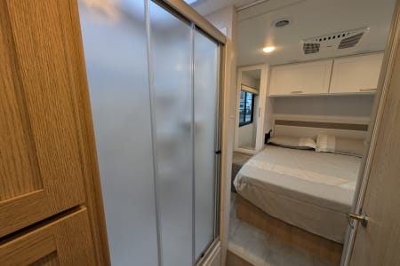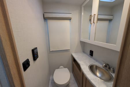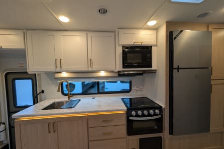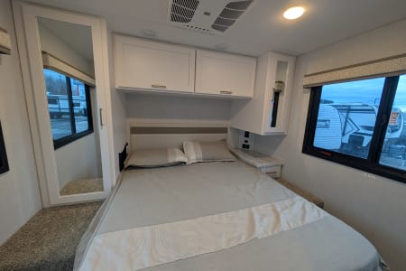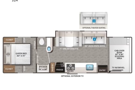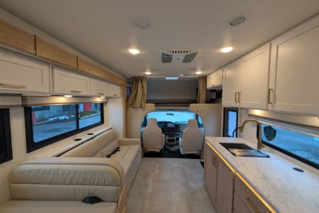 You and your spouse can go on your best adventures in this motorhome! You will have great views out of the many windows when you are indoors, and the power awning offers an outdoor living area protected by the elements when you want some fresh air. The cook will love the large single bowl stainless steel sink with a single handle faucet with a pull-down sprayer when cleaning fruits and veggies, the gas cooktop and microwave when making meals, as well as the 12V refrigerator to hold all the cold items. The slide out creates even more floor space, the 71" Dream Dinette and 66" jackknife sofa offers a place to dine and visit as well as sleep, and the rear private bedroom with a full bathroom just steps away will complete the deal! You will also appreciate the optional exterior TV to watch your favorite shows while breathing in fresh air!