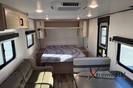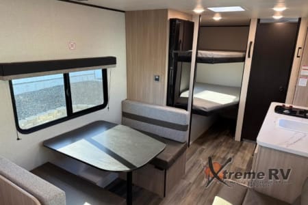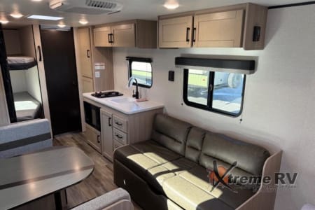 If you enjoy camping with a larger group, this travel trailer is perfect for you! There are double-size bunks in the back, which are right next to the private bath with a toilet and 40" shower. You can take the front queen bed with dual wardrobes, and any other guests can convert the sofa and booth dinette to sleeping space. A two-burner cooktop will let you make breakfast for everyone in the morning, and a 12V refrigerator will keep your perishables fresh!