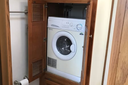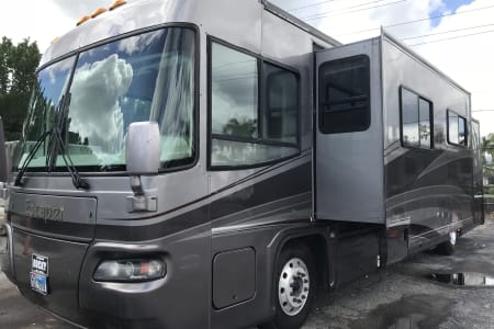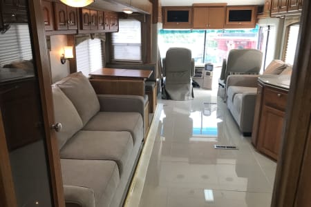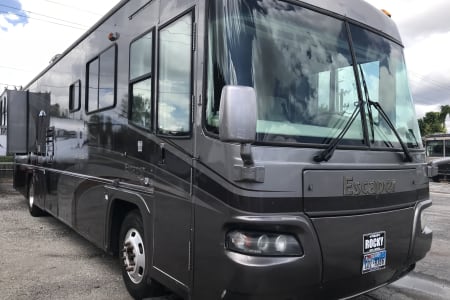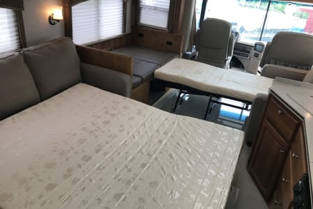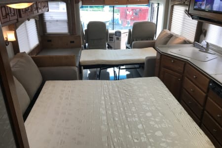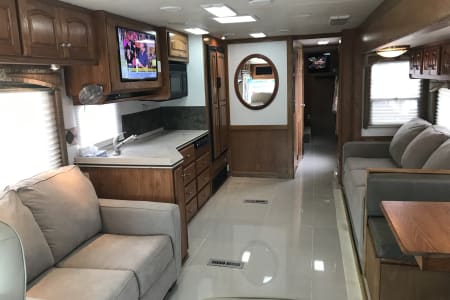Yes this is the actual RV in the pictures. 40 Feet Rig DIESEL Pusher. A very clean, well kept gem. We take pride in keeping the Escaper in tip top shape and completely stocked. With our work and lifestyle I like to keep the Escaper loaded with everything from pots, pans, dishes, linens. We always keep it with a full tank of Diesel fuel ready to go at a moments notice. If you can think of something that may make a trip easier or more enjoyable we will more than likely add it to the rig. I am more than happy to work with anyone no matter the knowledge and do everything to make renting as smooth and enjoyable as possible. It has a HDTV flat screen in the main living area, dvd player, movies streamer and another one HDTV flat screen in the bedroom. Netflix movies available also. Has a queen mattress, a pull out couch with a standard mattress and there is a memory foam queen mattress on the pull out sofa as well, there is another couch that open to a bed and can sleep two children. It does have Washer and Dryer.